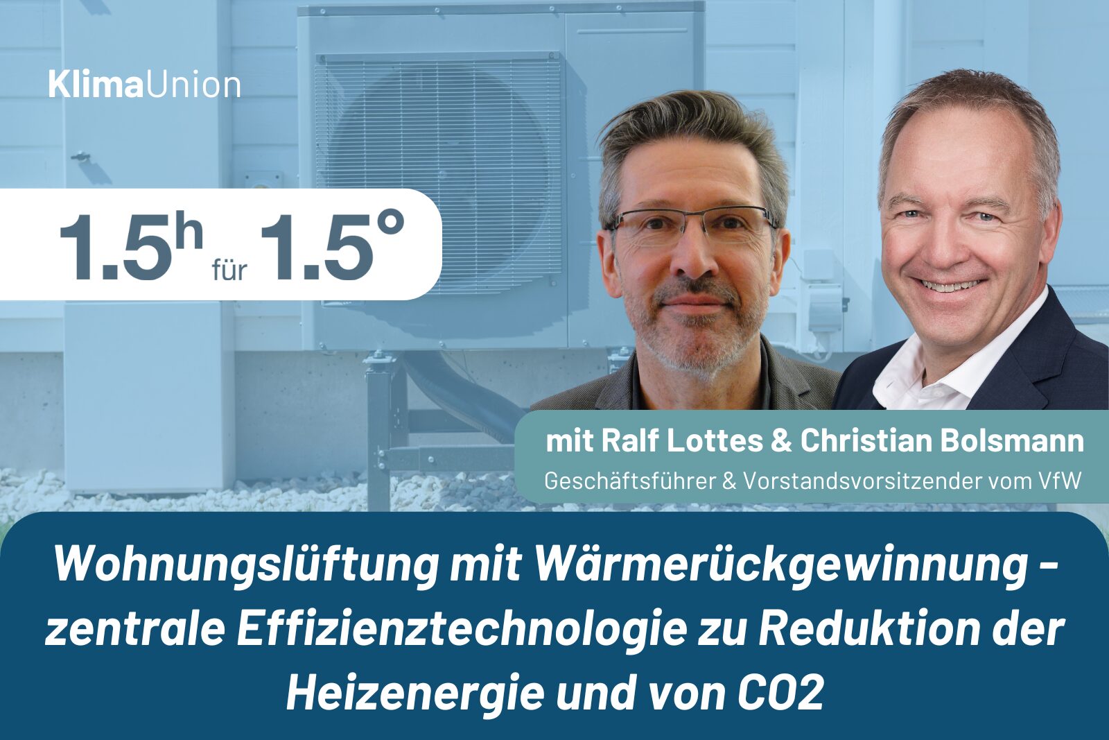 Am 04.02.2026 findet unser nächster 1,5°- Call, mit Christian Bolsmann (Vorstandsvorsitzender) und Ralf Lottes (Geschäftsführer) des Bundesverbandes für Wohnungslüftung e.V., via Zoom statt. Die beiden werden...